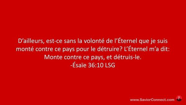 D'ailleurs, est-ce sans la volonté de l'Éternel que je suis monté contre ce pays pour le détruire? L'Éternel m'a dit: Monte contre ce pays, et détruis-le. -Ésaïe 36:10 LSG