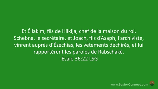 Et Éliakim, fils de Hilkija, chef de la maison du roi, Schebna, le secrétaire, et Joach, fils d'Asaph, l'archiviste, vinrent auprès d'Ézéchias, les vêtements déchirés, et lui rapportèrent les paroles de Rabschaké. -Ésaïe 36:22 LSG