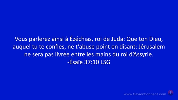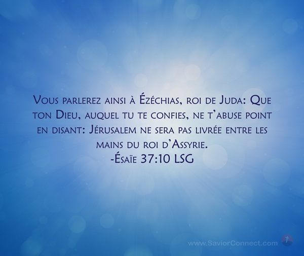 Vous parlerez ainsi à Ézéchias, roi de Juda: Que ton Dieu, auquel tu te confies, ne t'abuse point en disant: Jérusalem ne sera pas livrée entre les mains du roi d'Assyrie. -Ésaïe 37:10 LSG