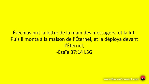 Ézéchias prit la lettre de la main des messagers, et la lut. Puis il monta à la maison de l'Éternel, et la déploya devant l'Éternel, -Ésaïe 37:14 LSG