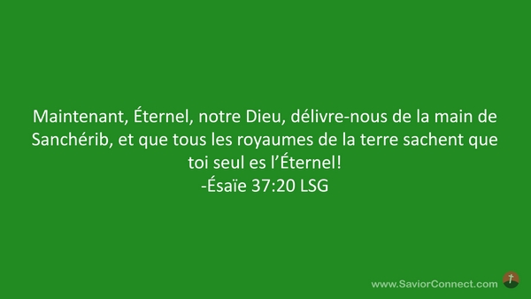 Maintenant, Éternel, notre Dieu, délivre-nous de la main de Sanchérib, et que tous les royaumes de la terre sachent que toi seul es l'Éternel! -Ésaïe 37:20 LSG
