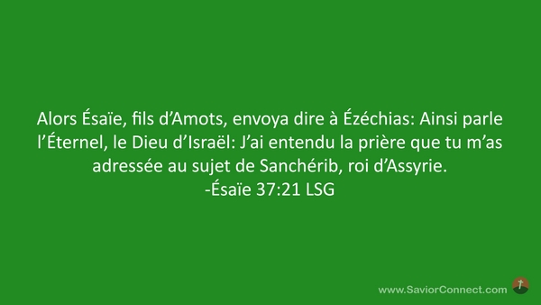 Alors Ésaïe, fils d'Amots, envoya dire à Ézéchias: Ainsi parle l'Éternel, le Dieu d'Israël: J'ai entendu la prière que tu m'as adressée au sujet de Sanchérib, roi d'Assyrie. -Ésaïe 37:21 LSG