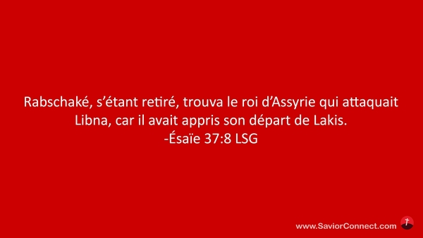 Rabschaké, s'étant retiré, trouva le roi d'Assyrie qui attaquait Libna, car il avait appris son départ de Lakis. -Ésaïe 37:8 LSG