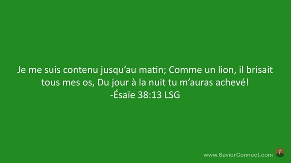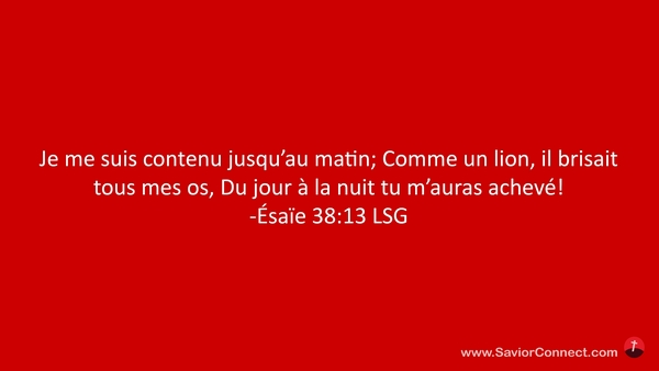 Je me suis contenu jusqu'au matin; Comme un lion, il brisait tous mes os, Du jour à la nuit tu m'auras achevé! -Ésaïe 38:13 LSG