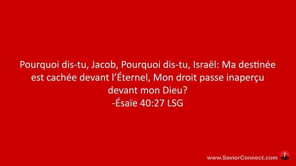 Pourquoi dis-tu, Jacob, Pourquoi dis-tu, Israël: Ma destinée est cachée devant l'Éternel, Mon droit passe inaperçu devant mon Dieu? -Ésaïe 40:27 LSG