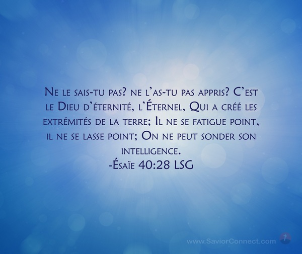 Ne le sais-tu pas? ne l'as-tu pas appris? C'est le Dieu d'éternité, l'Éternel, Qui a créé les extrémités de la terre; Il ne se fatigue point, il ne se lasse point; On ne peut sonder son intelligence. -Ésaïe 40:28 LSG