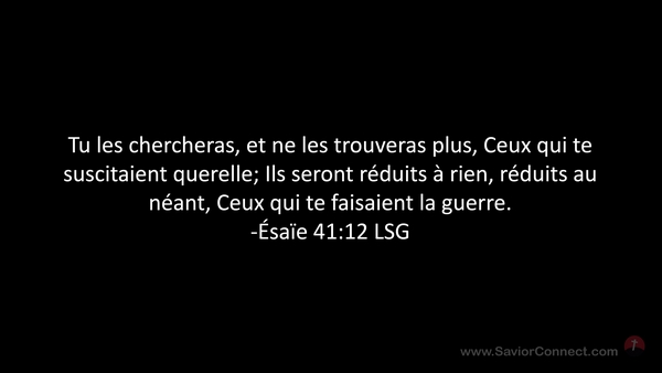 Tu les chercheras, et ne les trouveras plus, Ceux qui te suscitaient querelle; Ils seront réduits à rien, réduits au néant, Ceux qui te faisaient la guerre. -Ésaïe 41:12 LSG