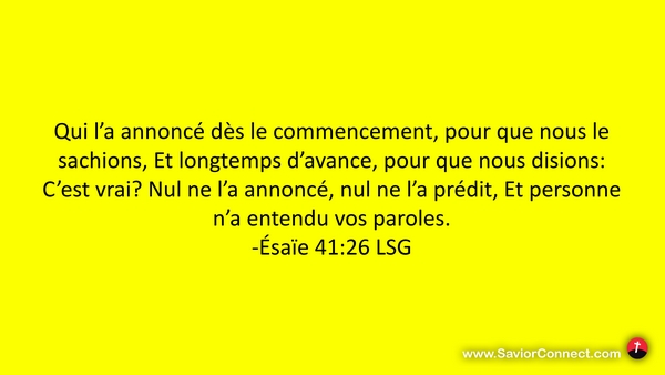 Qui l'a annoncé dès le commencement, pour que nous le sachions, Et longtemps d'avance, pour que nous disions: C'est vrai? Nul ne l'a annoncé, nul ne l'a prédit, Et personne n'a entendu vos paroles. -Ésaïe 41:26 LSG