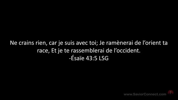 Ne crains rien, car je suis avec toi; Je ramènerai de l'orient ta race, Et je te rassemblerai de l'occident. -Ésaïe 43:5 LSG
