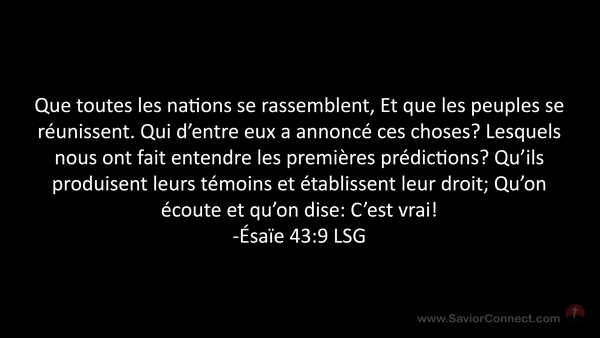 Que toutes les nations se rassemblent, Et que les peuples se réunissent. Qui d'entre eux a annoncé ces choses? Lesquels nous ont fait entendre les premières prédictions? Qu'ils produisent leurs témoins et établissent leur droit; Qu'on écoute et qu'on dise: C'est vrai! -Ésaïe 43:9 LSG