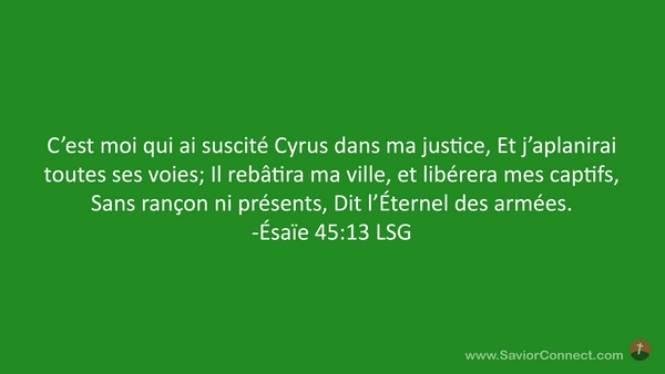 C'est moi qui ai suscité Cyrus dans ma justice, Et j'aplanirai toutes ses voies; Il rebâtira ma ville, et libérera mes captifs, Sans rançon ni présents, Dit l'Éternel des armées. -Ésaïe 45:13 LSG