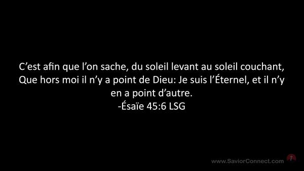 C'est afin que l'on sache, du soleil levant au soleil couchant, Que hors moi il n'y a point de Dieu: Je suis l'Éternel, et il n'y en a point d'autre. -Ésaïe 45:6 LSG