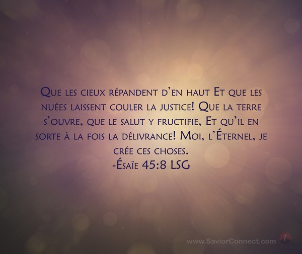 Que les cieux répandent d'en haut Et que les nuées laissent couler la justice! Que la terre s'ouvre, que le salut y fructifie, Et qu'il en sorte à la fois la délivrance! Moi, l'Éternel, je crée ces choses. -Ésaïe 45:8 LSG