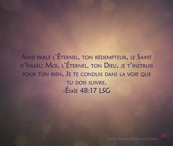 Ainsi parle l'Éternel, ton rédempteur, le Saint d'Israël: Moi, l'Éternel, ton Dieu, je t'instruis pour ton bien, Je te conduis dans la voie que tu dois suivre. -Ésaïe 48:17 LSG