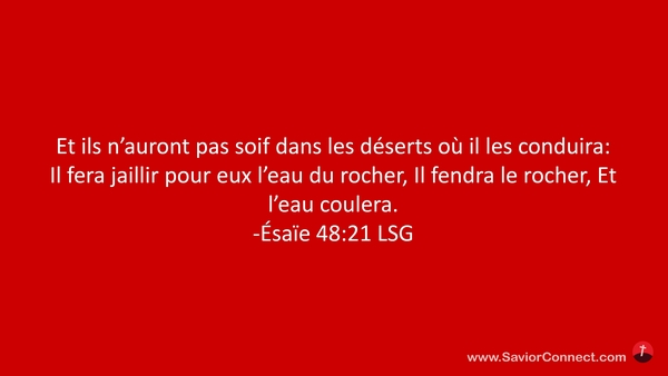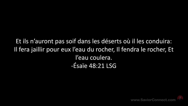 Et ils n'auront pas soif dans les déserts où il les conduira: Il fera jaillir pour eux l'eau du rocher, Il fendra le rocher, Et l'eau coulera. -Ésaïe 48:21 LSG