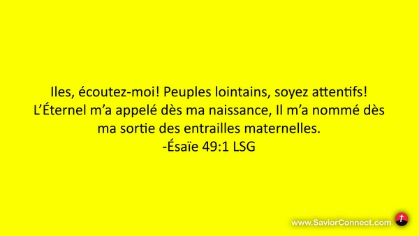 Iles, écoutez-moi! Peuples lointains, soyez attentifs! L'Éternel m'a appelé dès ma naissance, Il m'a nommé dès ma sortie des entrailles maternelles. -Ésaïe 49:1 LSG
