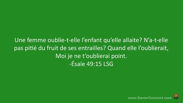 Une femme oublie-t-elle l'enfant qu'elle allaite? N'a-t-elle pas pitié du fruit de ses entrailles? Quand elle l'oublierait, Moi je ne t'oublierai point. -Ésaïe 49:15 LSG