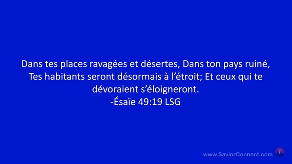 Dans tes places ravagées et désertes, Dans ton pays ruiné, Tes habitants seront désormais à l'étroit; Et ceux qui te dévoraient s'éloigneront. -Ésaïe 49:19 LSG