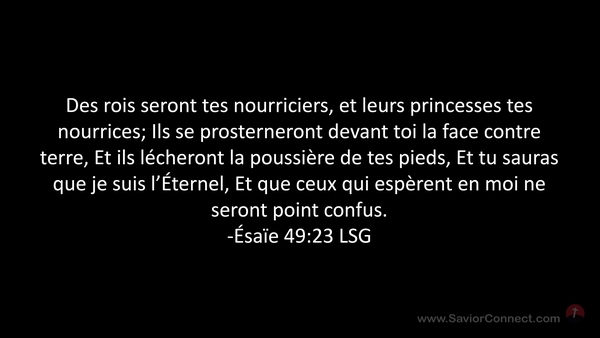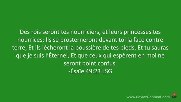 Des rois seront tes nourriciers, et leurs princesses tes nourrices; Ils se prosterneront devant toi la face contre terre, Et ils lécheront la poussière de tes pieds, Et tu sauras que je suis l'Éternel, Et que ceux qui espèrent en moi ne seront point confus. -Ésaïe 49:23 LSG