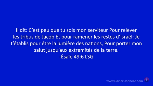 Il dit: C'est peu que tu sois mon serviteur Pour relever les tribus de Jacob Et pour ramener les restes d'Israël: Je t'établis pour être la lumière des nations, Pour porter mon salut jusqu'aux extrémités de la terre. -Ésaïe 49:6 LSG