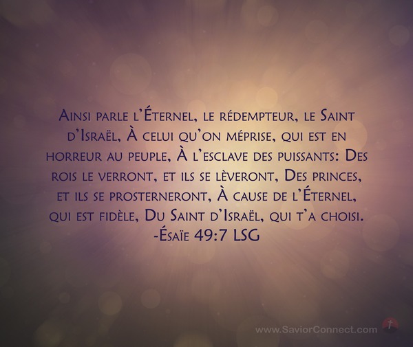 Ainsi parle l'Éternel, le rédempteur, le Saint d'Israël, À celui qu'on méprise, qui est en horreur au peuple, À l'esclave des puissants: Des rois le verront, et ils se lèveront, Des princes, et ils se prosterneront, À cause de l'Éternel, qui est fidèle, Du Saint d'Israël, qui t'a choisi. -Ésaïe 49:7 LSG