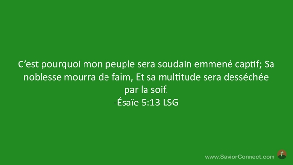 C'est pourquoi mon peuple sera soudain emmené captif; Sa noblesse mourra de faim, Et sa multitude sera desséchée par la soif. -Ésaïe 5:13 LSG