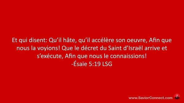 Et qui disent: Qu'il hâte, qu'il accélère son oeuvre, Afin que nous la voyions! Que le décret du Saint d'Israël arrive et s'exécute, Afin que nous le connaissions! -Ésaïe 5:19 LSG