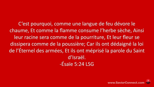 C'est pourquoi, comme une langue de feu dévore le chaume, Et comme la flamme consume l'herbe sèche, Ainsi leur racine sera comme de la pourriture, Et leur fleur se dissipera comme de la poussière; Car ils ont dédaigné la loi de l'Éternel des armées, Et ils ont méprisé la parole du Saint d'Israël. -Ésaïe 5:24 LSG