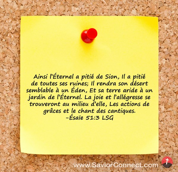 Ainsi l'Éternel a pitié de Sion, Il a pitié de toutes ses ruines; Il rendra son désert semblable à un Éden, Et sa terre aride à un jardin de l'Éternel. La joie et l'allégresse se trouveront au milieu d'elle, Les actions de grâces et le chant des cantiques. -Ésaïe 51:3 LSG