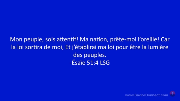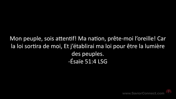 Mon peuple, sois attentif! Ma nation, prête-moi l'oreille! Car la loi sortira de moi, Et j'établirai ma loi pour être la lumière des peuples. -Ésaïe 51:4 LSG
