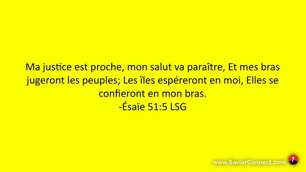 Ma justice est proche, mon salut va paraître, Et mes bras jugeront les peuples; Les îles espéreront en moi, Elles se confieront en mon bras. -Ésaïe 51:5 LSG