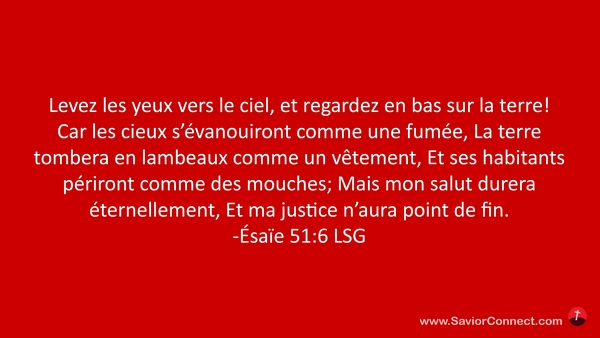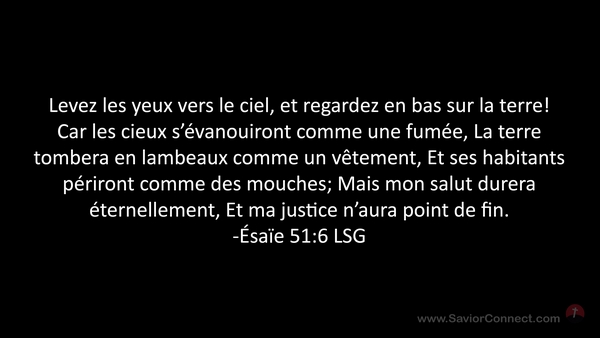 Levez les yeux vers le ciel, et regardez en bas sur la terre! Car les cieux s'évanouiront comme une fumée, La terre tombera en lambeaux comme un vêtement, Et ses habitants périront comme des mouches; Mais mon salut durera éternellement, Et ma justice n'aura point de fin. -Ésaïe 51:6 LSG