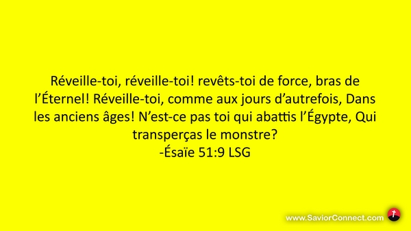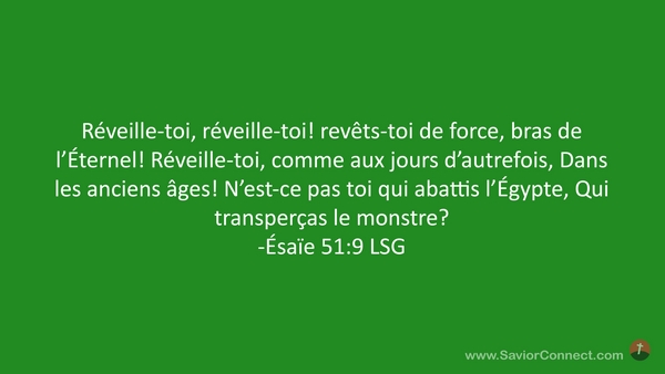 Réveille-toi, réveille-toi! revêts-toi de force, bras de l'Éternel! Réveille-toi, comme aux jours d'autrefois, Dans les anciens âges! N'est-ce pas toi qui abattis l'Égypte, Qui transperças le monstre? -Ésaïe 51:9 LSG