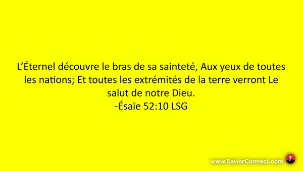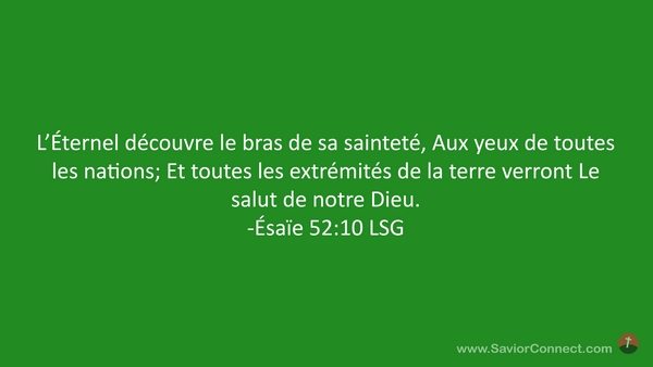 L'Éternel découvre le bras de sa sainteté, Aux yeux de toutes les nations; Et toutes les extrémités de la terre verront Le salut de notre Dieu. -Ésaïe 52:10 LSG