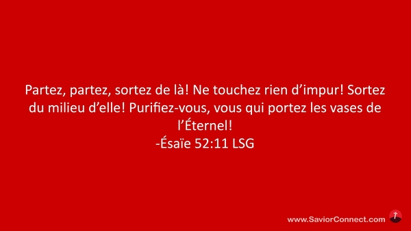 Partez, partez, sortez de là! Ne touchez rien d'impur! Sortez du milieu d'elle! Purifiez-vous, vous qui portez les vases de l'Éternel! -Ésaïe 52:11 LSG