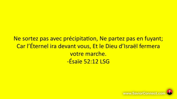 Ne sortez pas avec précipitation, Ne partez pas en fuyant; Car l'Éternel ira devant vous, Et le Dieu d'Israël fermera votre marche. -Ésaïe 52:12 LSG