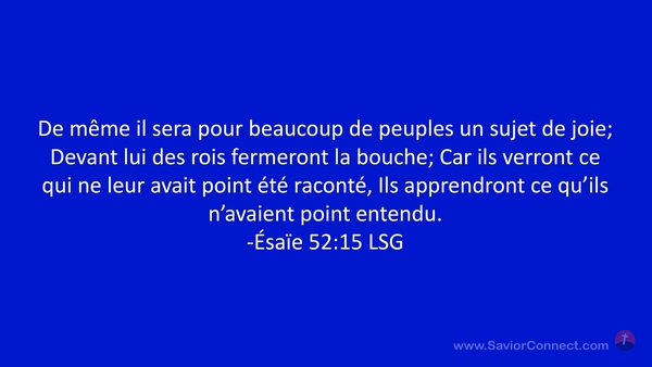 De même il sera pour beaucoup de peuples un sujet de joie; Devant lui des rois fermeront la bouche; Car ils verront ce qui ne leur avait point été raconté, Ils apprendront ce qu'ils n'avaient point entendu. -Ésaïe 52:15 LSG