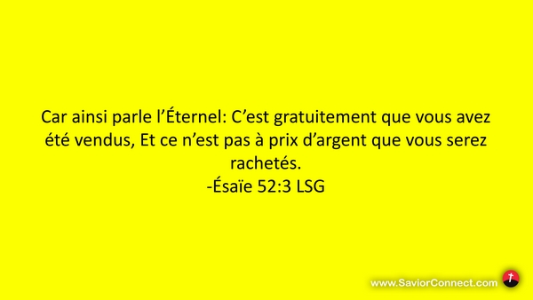 Car ainsi parle l'Éternel: C'est gratuitement que vous avez été vendus, Et ce n'est pas à prix d'argent que vous serez rachetés. -Ésaïe 52:3 LSG