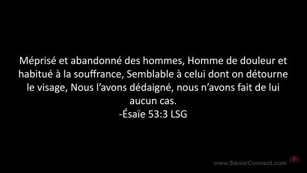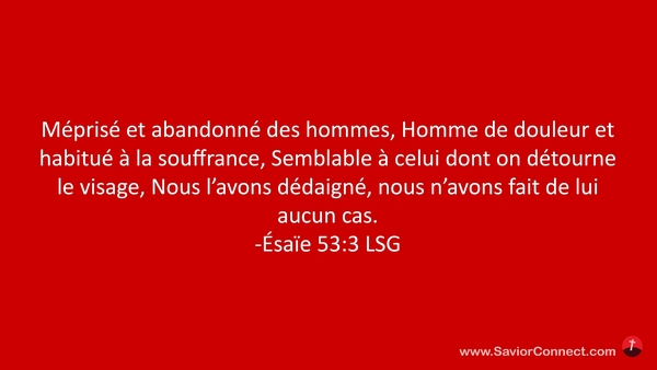 Méprisé et abandonné des hommes, Homme de douleur et habitué à la souffrance, Semblable à celui dont on détourne le visage, Nous l'avons dédaigné, nous n'avons fait de lui aucun cas. -Ésaïe 53:3 LSG