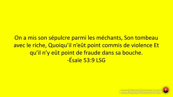 On a mis son sépulcre parmi les méchants, Son tombeau avec le riche, Quoiqu'il n'eût point commis de violence Et qu'il n'y eût point de fraude dans sa bouche. -Ésaïe 53:9 LSG