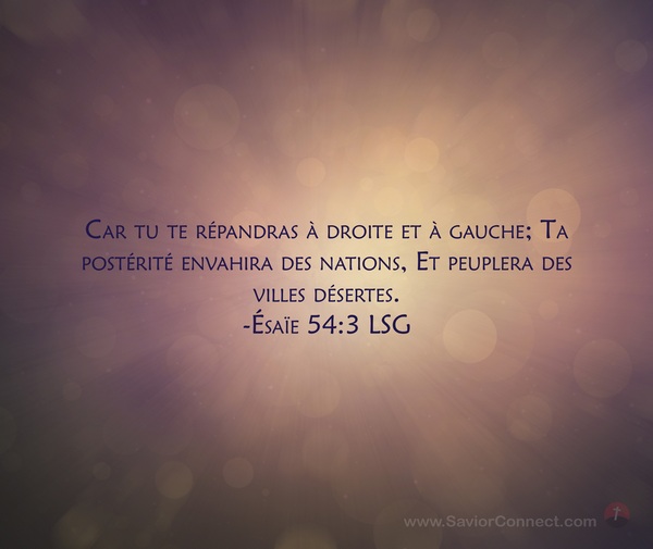 Car tu te répandras à droite et à gauche; Ta postérité envahira des nations, Et peuplera des villes désertes. -Ésaïe 54:3 LSG