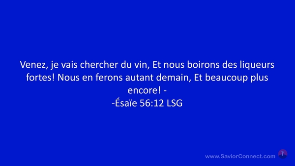 Venez, je vais chercher du vin, Et nous boirons des liqueurs fortes! Nous en ferons autant demain, Et beaucoup plus encore! - -Ésaïe 56:12 LSG