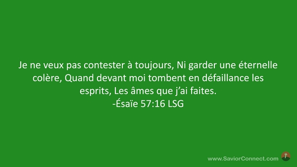 Je ne veux pas contester à toujours, Ni garder une éternelle colère, Quand devant moi tombent en défaillance les esprits, Les âmes que j'ai faites. -Ésaïe 57:16 LSG
