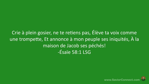 Crie à plein gosier, ne te retiens pas, Élève ta voix comme une trompette, Et annonce à mon peuple ses iniquités, À la maison de Jacob ses péchés! -Ésaïe 58:1 LSG