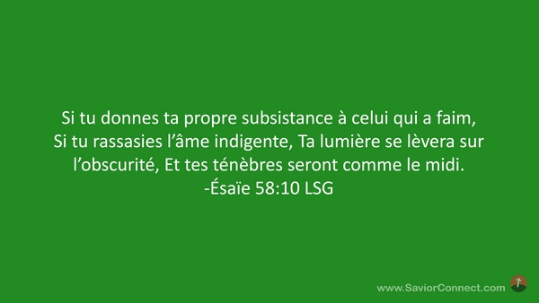 Si tu donnes ta propre subsistance à celui qui a faim, Si tu rassasies l'âme indigente, Ta lumière se lèvera sur l'obscurité, Et tes ténèbres seront comme le midi. -Ésaïe 58:10 LSG