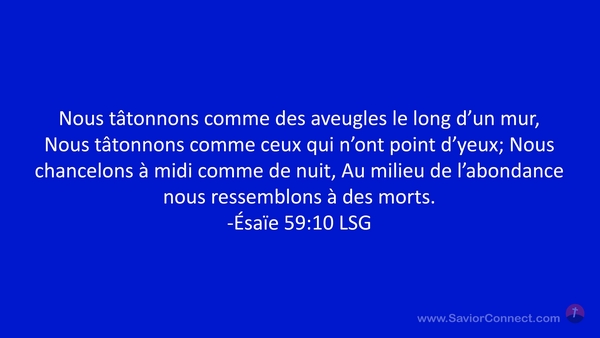 Nous tâtonnons comme des aveugles le long d'un mur, Nous tâtonnons comme ceux qui n'ont point d'yeux; Nous chancelons à midi comme de nuit, Au milieu de l'abondance nous ressemblons à des morts. -Ésaïe 59:10 LSG