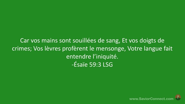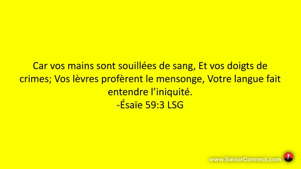 Car vos mains sont souillées de sang, Et vos doigts de crimes; Vos lèvres profèrent le mensonge, Votre langue fait entendre l'iniquité. -Ésaïe 59:3 LSG