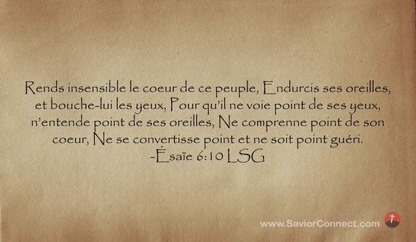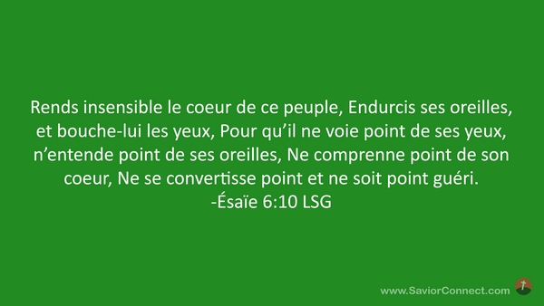 Rends insensible le coeur de ce peuple, Endurcis ses oreilles, et bouche-lui les yeux, Pour qu'il ne voie point de ses yeux, n'entende point de ses oreilles, Ne comprenne point de son coeur, Ne se convertisse point et ne soit point guéri. -Ésaïe 6:10 LSG