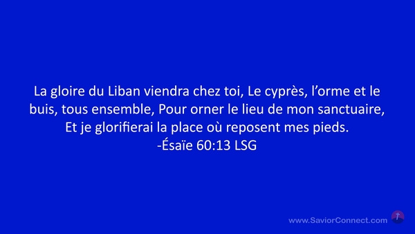 La gloire du Liban viendra chez toi, Le cyprès, l'orme et le buis, tous ensemble, Pour orner le lieu de mon sanctuaire, Et je glorifierai la place où reposent mes pieds. -Ésaïe 60:13 LSG