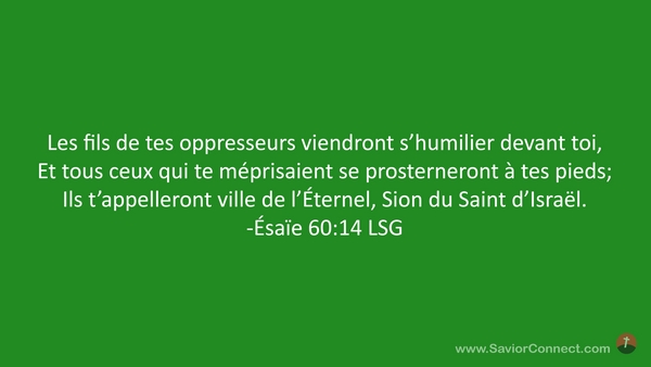 Les fils de tes oppresseurs viendront s'humilier devant toi, Et tous ceux qui te méprisaient se prosterneront à tes pieds; Ils t'appelleront ville de l'Éternel, Sion du Saint d'Israël. -Ésaïe 60:14 LSG